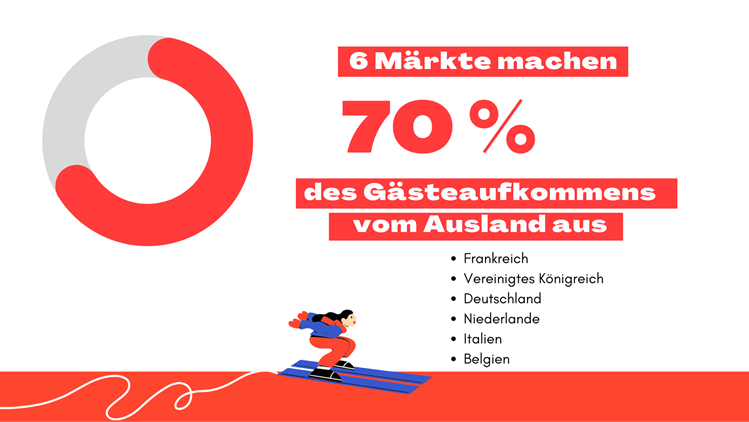 - Für das Wallis wichtige Nahmärkte wie Deutschland und Belgien sind rückgängig, während das Vereinigte Königreich, die Niederlande und Frankreich einen soliden Aufschwung verzeichnen. Im Winter 2022-23 kehren die Fernmärkte aus Nordamerika und Asien zurück.