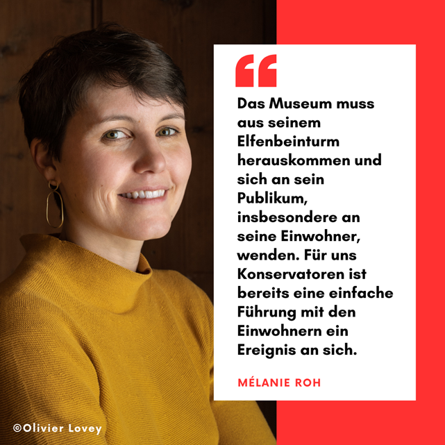 Für uns Konservatoren ist schon eine einfache Führung mit den Einwohnern ein Ereignis an sich. Das Bedürfnis, Wissen weiterzugeben, bleibt eine Hauptaufgabe. Natürlich kann das Museum auch als Ort für Konzerte und Aufführungen dienen. Aber wird das Publikum, das zu einem Konzert gekommen ist, schließlich das Museum besuchen? Sollte sich das Museum für dieses Unterhaltung suchende Publikum interessieren? Oder sollte es sich auf Museums-"Puristen" konzentrieren, die eine Führung durch die Sammlungen oder einen Vortrag schätzen? Für Mélanie Roh geht es darum, das richtige Gleichgewicht zwischen kultureller Vermittlung und Animation zu finden.