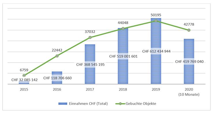Entwicklung der Gesamteinnahmen (in CHF), die seit 2015 in der Schweiz pro Jahr mit Airbnb erzielt wurden und im Vergleich dazu die Anzahl der reservierten Unterkünfte: