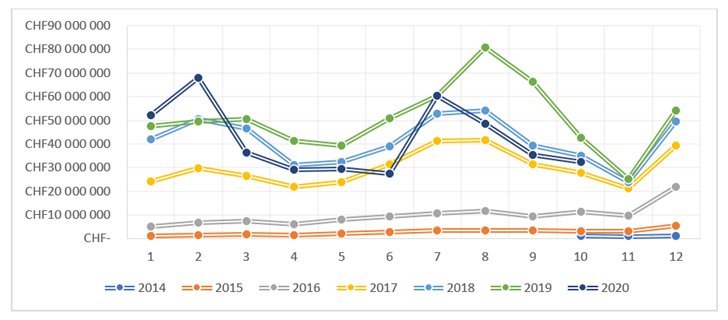 Jahr für Jahr Vergleich der Gesamteinnahmen (in CHF), die seit Oktober 2014 monatlich von Airbnb in der Schweiz erzielt wurden:
