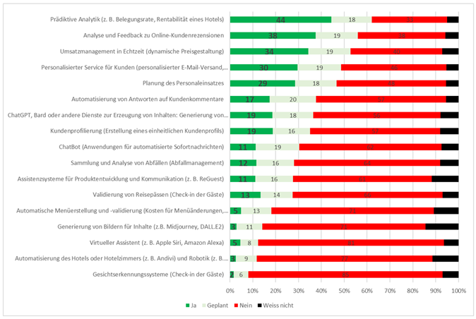 KI-Adaption: In der sich entwickelnden KI-Landschaft im Gastgewerbe ragt die prädiktive Analyse heraus, die es Hotels ermöglicht, wichtige Kennzahlen wie Belegungsraten und Rentabilität vorherzusagen. Die schon recht weite Verbreitung von Tools zur Analyse von Online-Kundenbewertungen unterstreicht das Engagement der Branche, den Service auf der Grundlage von Gäste-Feedback zu verbessern. Technologien für Echtzeit-Revenue-Management und Personaleinsatzplanung belegen den Wunsch vieler Akteure zu betrieblicher Effizienz und dynamischer Preisgestaltung. Erste Betriebe haben bereits in Innovationen wie automatisierte Kundenantworten und Kundenprofilierung investiert, was einen wachsenden Trend zur Automatisierung und personalisierten Gästekommunikation in der Branche zeigt. Fortgeschrittene Technologien wie Gesichtserkennung und Hotelautomation befinden sich jedoch noch in der Entwicklungsphase. -> für Details siehe Grafik unten!