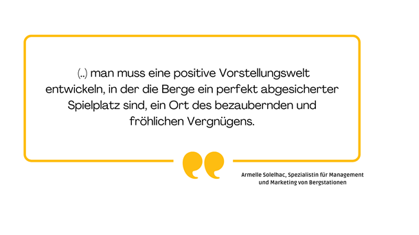 Armelle Solelhac, Spezialistin für Management und Marketing von Bergstationen, äußerte sich kürzlich zum Potenzial der Familienkunden bei der Erneuerung der Kundschaft für Bergdestinationen und erinnerte an die Notwendigkeit der an Kinder gerichteten Botschaft in der Kommunikation: "(...) man muss eine positive Vorstellungswelt entwickeln, in der die Berge ein perfekt abgesicherter Spielplatz sind, ein Ort des bezaubernden und fröhlichen Vergnügens."