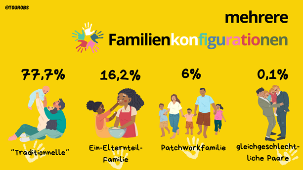 Auch wenn die "traditionelle" Familienkonstellation am weitesten verbreitet ist, nimmt der Anteil der Eineltern- und/oder Patchworkfamilien einen immer größeren Platz in der Gesellschaft ein.