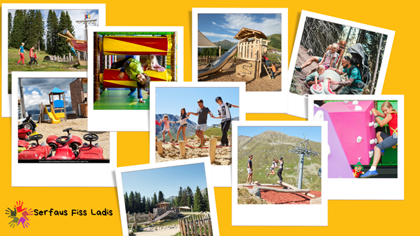 In erster Linie verfügt die Destination über zahlreiche Infrastrukturen und Einrichtungen. Angefangen beim Sommer-Fun-Park bei der Bergstation der Fiss-Lifte, der sich als wahrer Spielplatz für die ganze Familie präsentiert: mit Sandkasten, Seilbahnen, Rutschen, Sommerrodelbahn etc. Auf den Almen, am Waldrand oder bei der Ankunft der Skilifte hat Serfaus Fiss Ladis sich bemüht, zahlreiche Spielwelten zu schaffen, wie die der Piraten, der Murmeltiere oder auch der Archäologie. Hier kann man sich körperlichen Aktivitäten (Laufen, Springen, Klettern, Graben usw.) oder Entdeckungen (Rätsel, Schatzsuche usw.) hingeben. Diese Welten materialisieren sich durch Bauten und Dekorationen, die meist aus Holz bestehen.