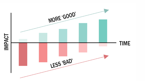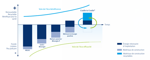 In der Baubranche wird dieser Wunsch, die positiven Auswirkungen über die negativen Auswirkungen zu stellen, im folgenden Diagramm veranschaulicht. Dank des Recyclings von Material und der Wiederverwendung, die zu einer gesteigerten Energieeffizienz hinzukommen, sind die netto positiven Beiträge gegeben.