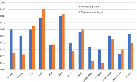 Ceci est dû notamment au réchauffement plus important durant les mois de janvier (0.6°C au lieu de 0.25° pour les stations d’altitude) et de février (0.5°au lieu de 0.23° pour les stations d’altitude).