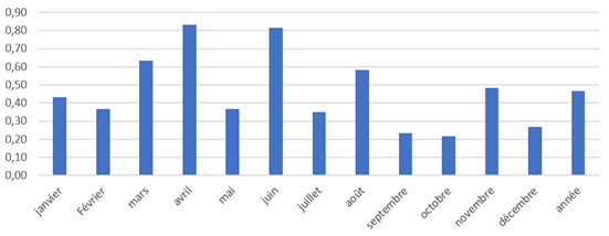 Avril et juin sont de loin les mois qui enregistrent le plus haut réchauffement (0.8°C) alors que septembre et octobre sont les mois pour lesquels la variation est la plus faible.