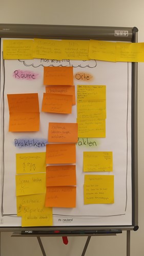 Ce projet est une des deux idées retenues et développées en deuxième partie du Forum Développement Durable 2023 dans le cadre de l’atelier « Lab 7 : Et si nous façonnions le futur de la commune de manière collective ? ». Celui-ci donnait l’opportunité de tester la force du collectif et d’expérimenter l’outil heuristique « Imagination Sundial », développé par Rob Shorter. Concrètement, les participants ont d’abord dû se laisser conter l’histoire du développement à Bâle décrit plus haut dans cet article. Puis ils ont été invités à analyser ce qui a été entendu : quels espaces mentaux et émotionnels, quels lieux, quelles pratiques et quels pactes ressortaient de l’histoire ? Après quoi, les réponses étaient consignées sur post-it et partagées à l’oral. À partir de ce diagnostic rapide, les participants ont ensuite été priés de consolider par leurs idées les espaces, lieux, pratiques et pactes qui permettraient d'ancrer encore mieux le développement durable dans le projet. Ces idées ont été notées sur des Post-its et disposées sur le canevas (cf. image ci-dessous). Les domaines d’application de l’outil sont multiples. Essayez.