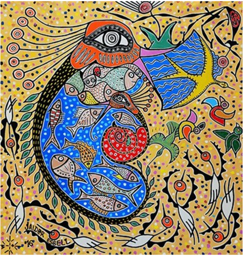 Arbre de la connaissance par Jaider Esbell. L’œuvre de cet artiste indigène entremêle les mythes indigènes, la critique de la culture hégémonique et les préoccupations socio-environnementales.