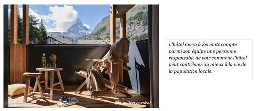 Une série de recommandations est également proposée directement pour les hôtels suisses en particulier, comme l'intégration des écosystèmes locaux, la priorité à l'intelligence humaine et la communication transparente sur les activités liées à la durabilité/régénération. Enfin, les hôtels sont encouragés à collaborer et à co-créer, éléments clés pour l'adoption réussie d'un état d'esprit régénérateur dans l'industrie hôtelière suisse.
